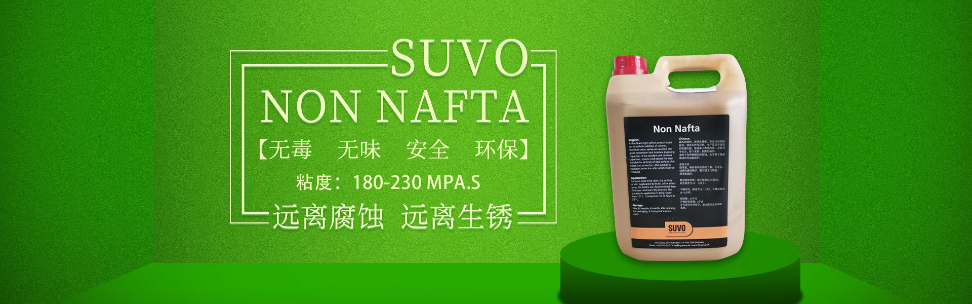 SUVO Non Nafta 是一款無毒、無味、安全、環(huán)保的油基/蠟基防銹產(chǎn)品,不含溶劑,內(nèi)含超強(qiáng)的防腐劑。 涂刷本產(chǎn)品后,會(huì)在被保護(hù)的工件表面形成一層80-100微米厚的油脂、蠟基保護(hù)膜,保護(hù)金屬產(chǎn)品免受惡劣環(huán)境侵害,遠(yuǎn)離腐蝕,遠(yuǎn)離生銹。 產(chǎn)品適合于鋼鐵制品在陸地存儲(chǔ)或海上運(yùn)輸過程中的長期防腐,防銹。本產(chǎn)品非常易于被石油精/煤油清洗劑清除,清洗過程不損傷工件表面,不污染施工環(huán)境。